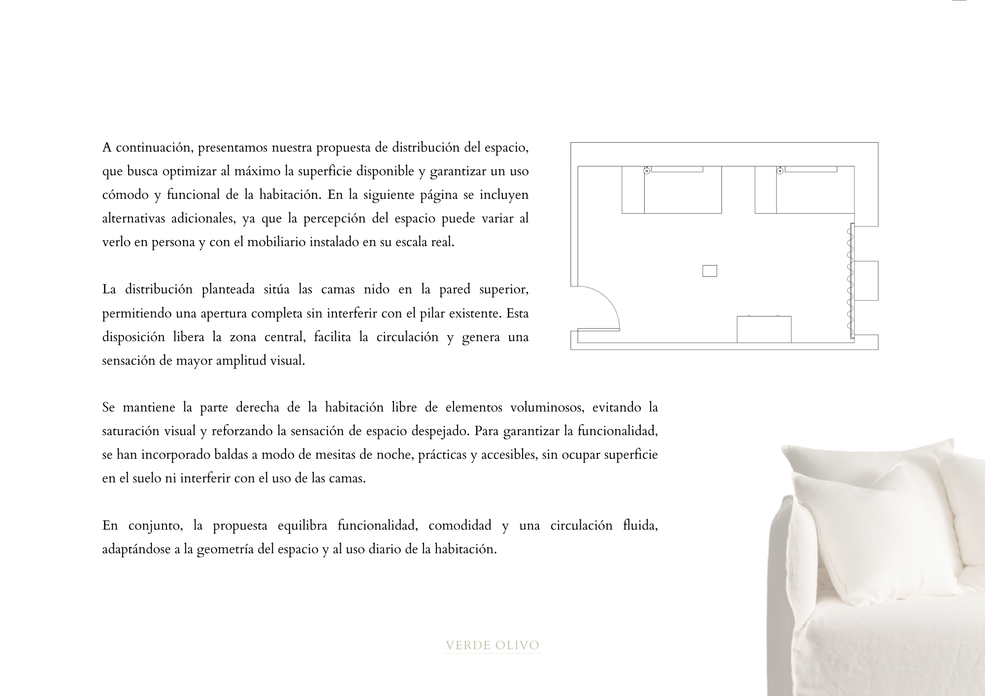 - Una propuesta de distribución del espacio, con la colocación recomendada del mobiliario para aprovecharlo mejor.